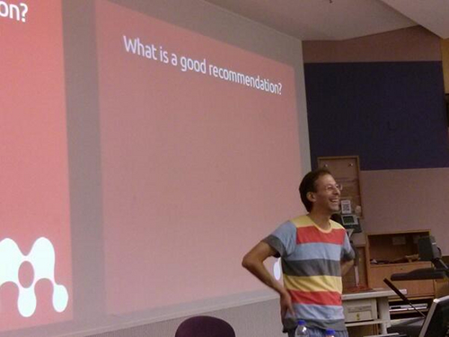 One challenge for anyone trying to build a recommender system is that it’s hard to tell whether or not your predictions are going to be accurate, at least until you start making them and can see how often your users actually accept your suggestions. As there is a huge space of possible methods to choose from – far too many to test every possibility on unsuspecting users – ideally we’d like to be able to figure how well each prediction formula (technically each mathematical model) matches reality before we get to that stage. If and how that might be possible was a recurring theme of this year’s conference, and the subject of my first talk in Hong Kong.