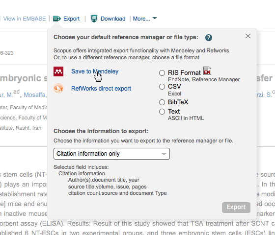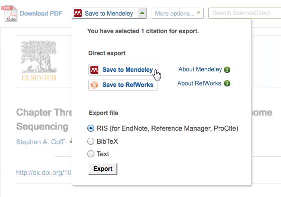 To give Mendeley users even more options though, we’ve also worked with Elsevier to build the “Export to Mendeley” functionalities right into the Scopus and Science Direct platforms, which means that you don’t even have to install the web importer to send articles and citations to Mendeley, and you can also choose which folder in your library they should go into.