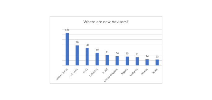 We’re also happy to see we have a good split of Advisors across the globe, with new Advisors based in 104 countries ranging from the Caribbean island of Saint Lucia to The Netherlands to Japan!